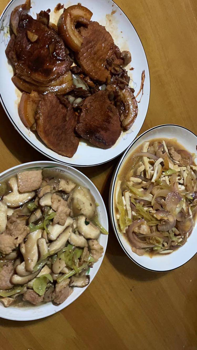 白水煮的鸭腿和五花肉,黄豆酱烧肉,红烧大排肉,女儿喜欢吃白水煮的东西,就着调料大蒜籽辣椒末还有香菜吃,黄豆酱烧肉也不错,放高压锅压一下,肉吃起来入口即化,酱汤拿来吃拌面拌粉干可好吃了,我做菜基本尽量不用下锅炒,简单方便,懒人的懒办法,我今天解放不用做饭了,老公回来了😄😄😄