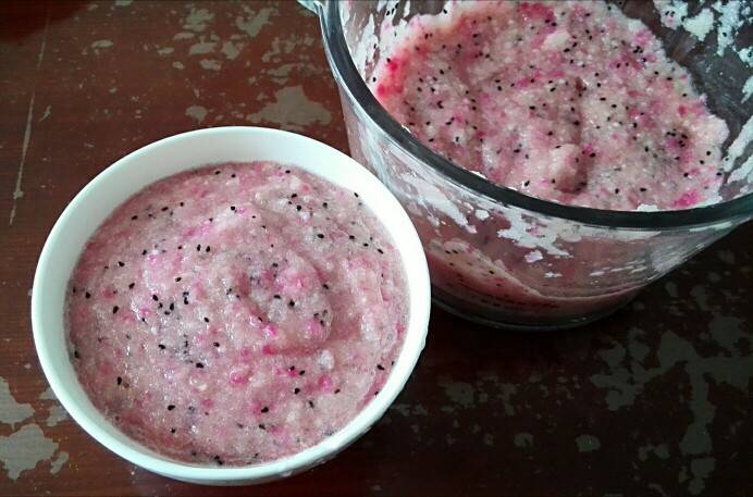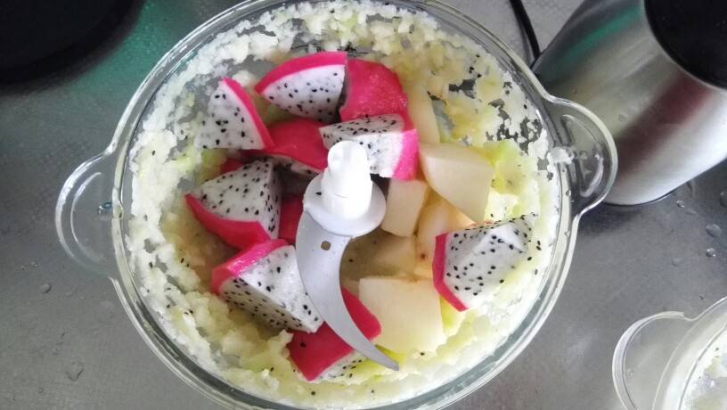 今日突发奇想 想吃苹果 但牙口不好 干脆打成泥吧 用家里绞陷机 可太单一 1苹果 2猕猴桃 1梨 半个削皮火龙果(刮皮刀挂掉表面果皮)弄了这么一锅 哈 还挺好吃 ~