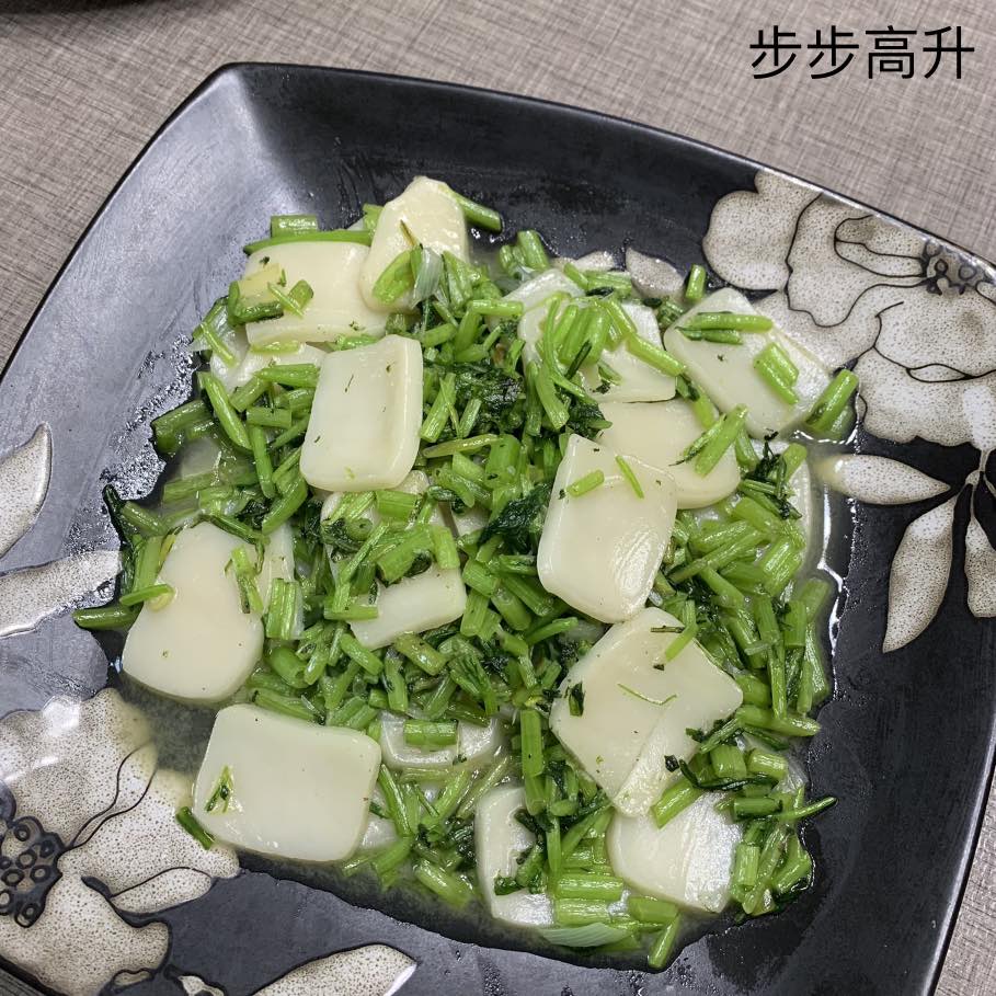 第九道菜:茼蒿炒年糕,寓意:步步高升