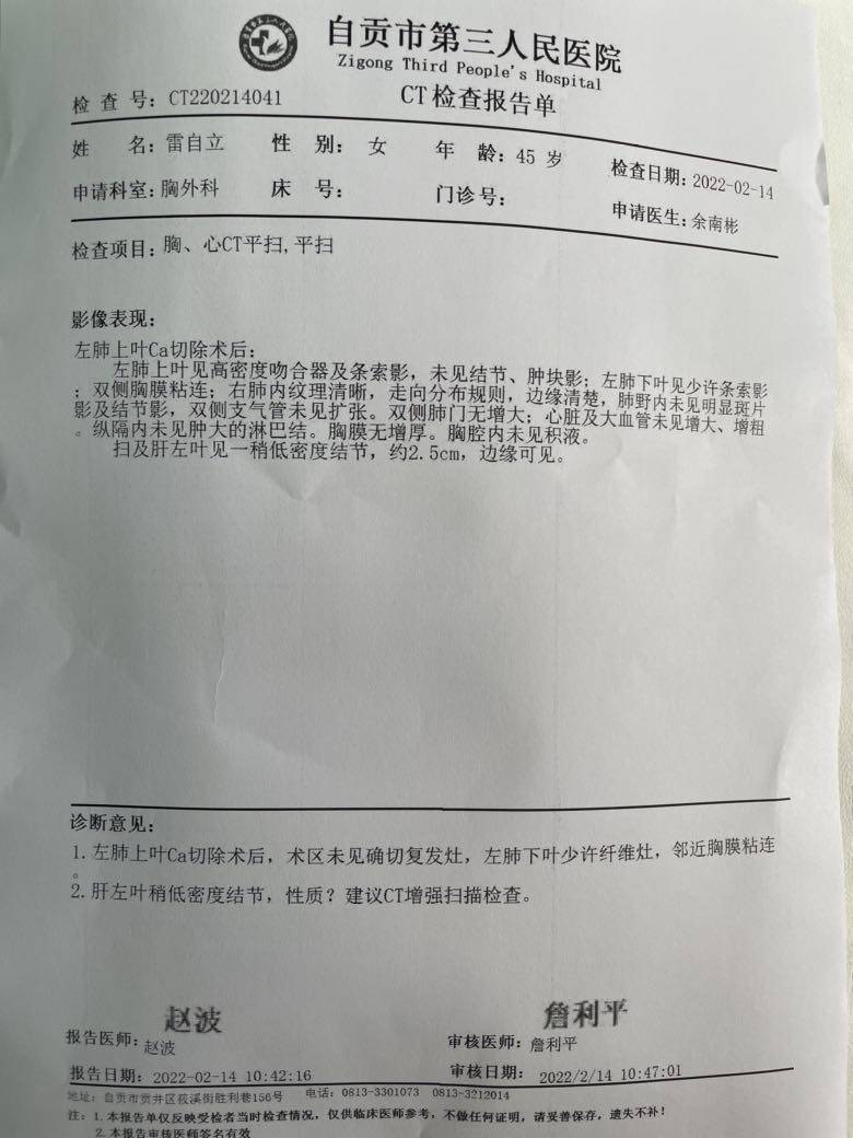 在网上预约挂号今天回自贡三医院复查,我的主治医生在他电脑上一看就说我四月复查了,已经大半年了。他给我开了血检和胸部Ct。