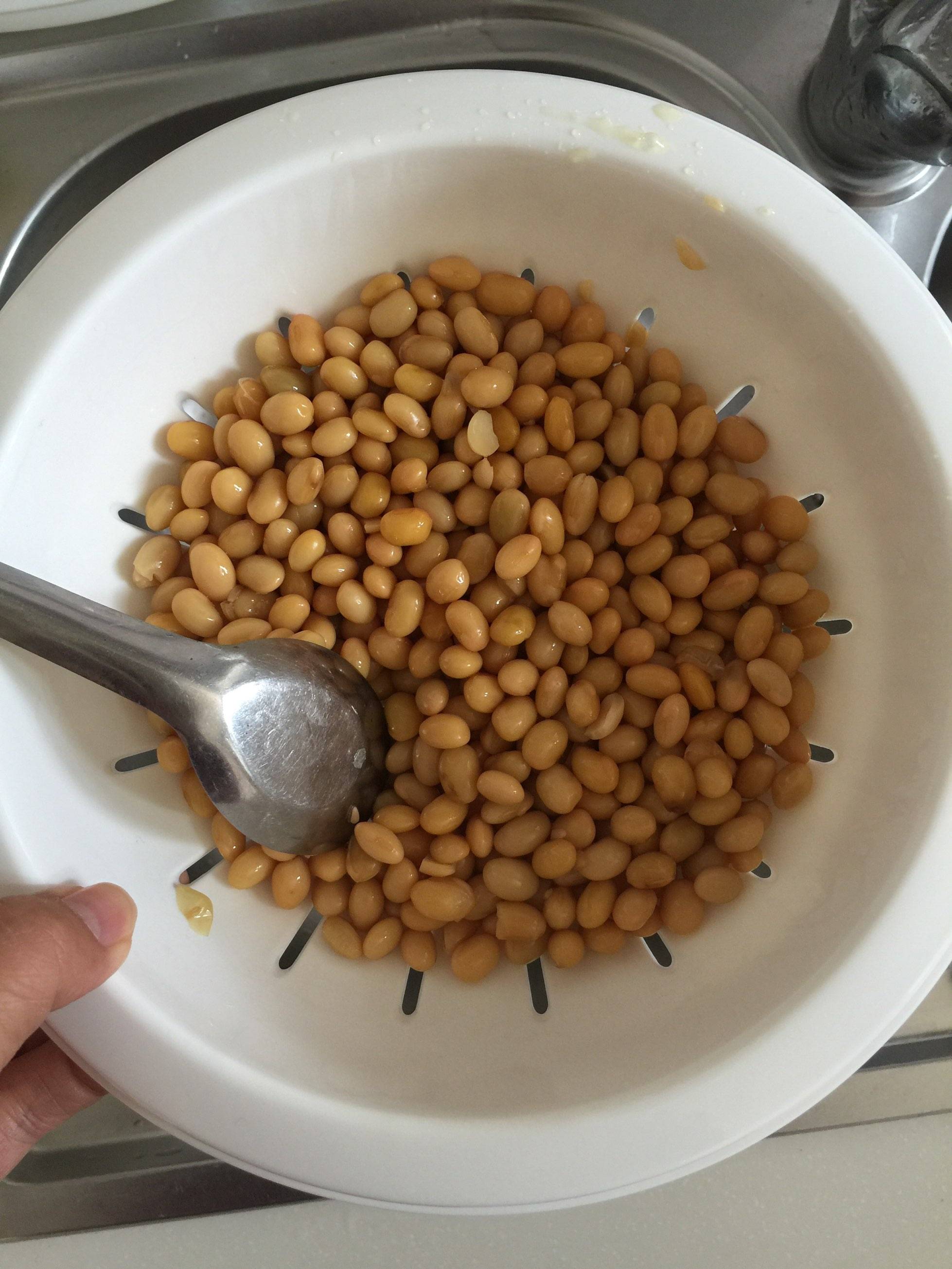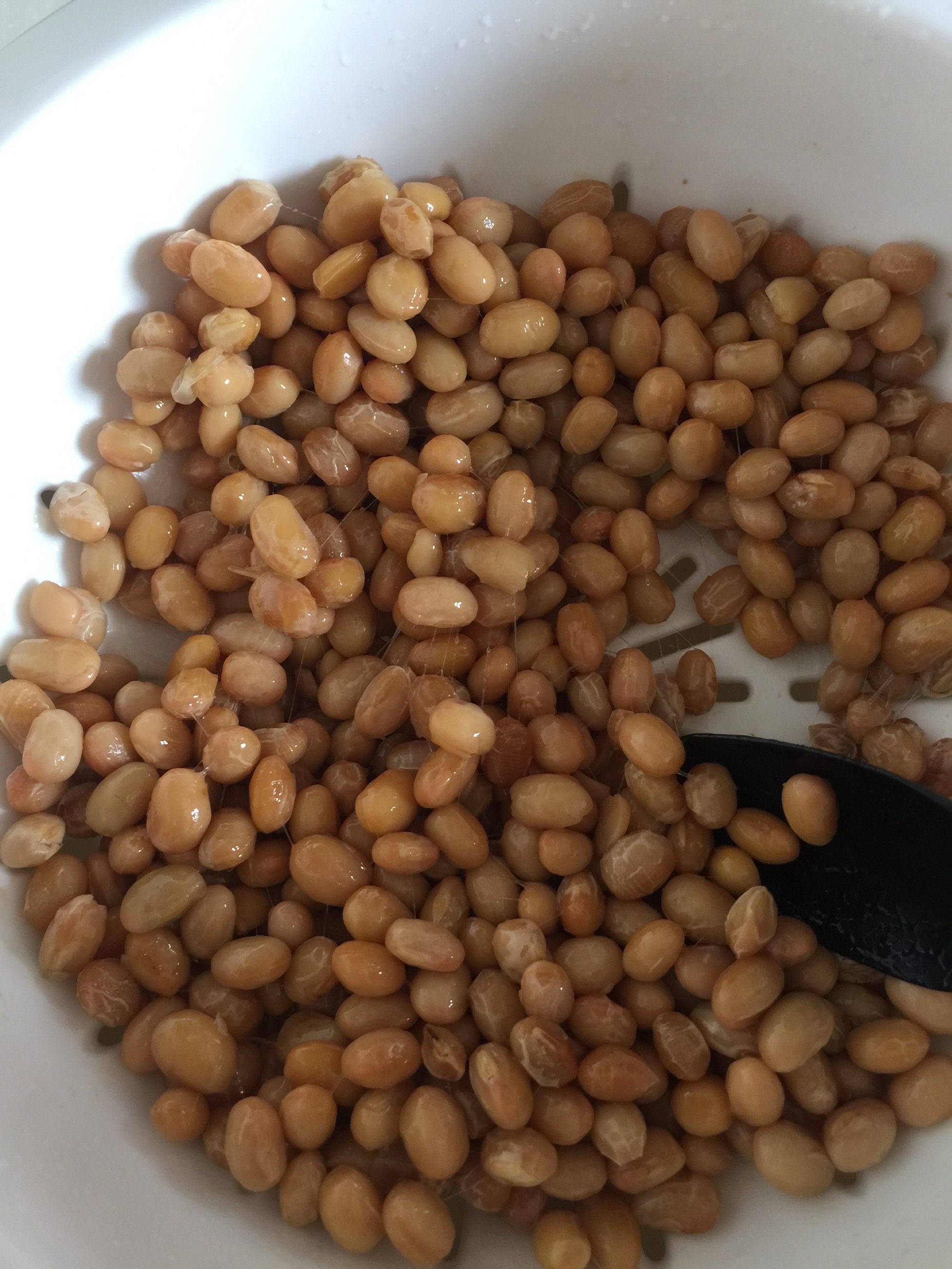 4、2小时后将蒸好的豆子充分搅拌一分钟,换成晒网,将水沥干,不滴水为原则,晾凉至35度左右