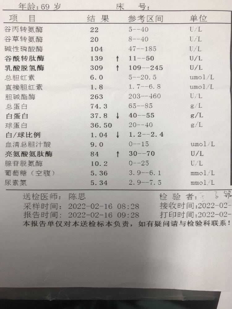 我父亲吃amg510一个半月,体感逐渐变好,肩膀不疼了,气短明显好转,体力也恢复了不少,昨天抽血查肺癌四项指标,角蛋白19丛吃药前的15降到6(标准上限3.3).nse从59降到14,已经在正常范围,ca125几乎没变化还是高,cea不是我父亲的敏感指标,一直都正常。可是肝功能有些指标异常,主治说谷丙谷草胆红素都正常,肝功能问题不大,父亲有肝转,之前ct显示胆汁淤积,熊去氧胆酸一直在吃。麻烦有经验的病友帮我看看,我父亲高的这几项肝功能指标需要什么治疗么?