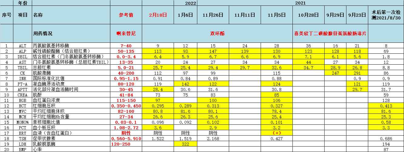 以下是进组后每次都检验结果数据,因为入组后,结果全部要上交数据中心,切不会和医院系统联网,为了以后结束临床后转普通医生跟进能更好了解我们的治疗过程和用药情况,所以只能自己拍照留档,做好电子记录留档。