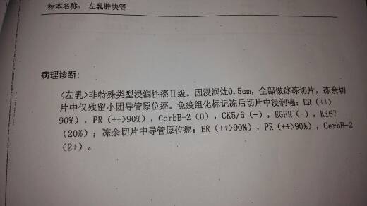 雌激素孕激素强阳性,表皮生长因子受体阴性,如保乳需放疗➕内分泌治疗,如全切仅需内分泌治疗。