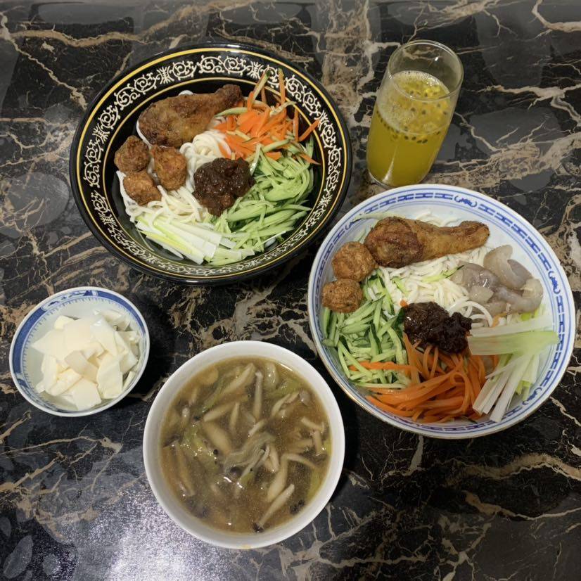 早餐🥣炸酱面,蟹味菇汤和笋片