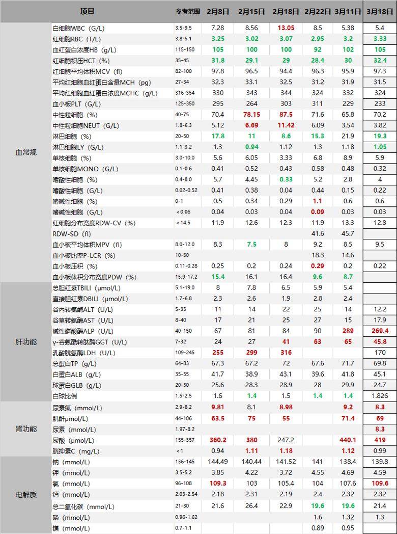 自3月4日出院以来,每周一次血常规和肝肾电检查,根据各项指标提示调整饮食和需要注意的地方。