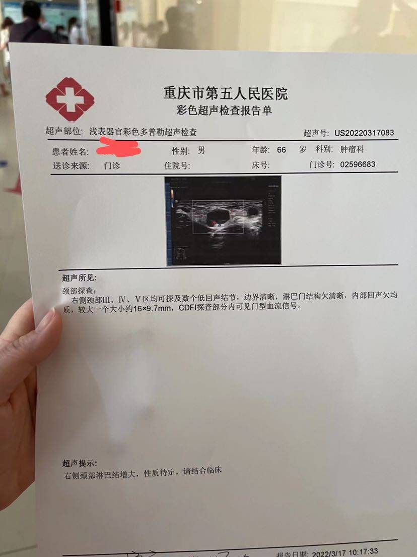 然后现在颈部淋巴结肿大,医生无法判断是转移还是炎症引起的,谁能帮我看看报告?