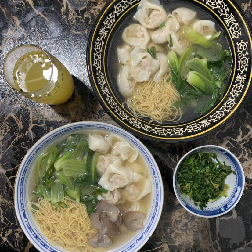 早餐🥣云吞面,拌芹菜叶,百香果水