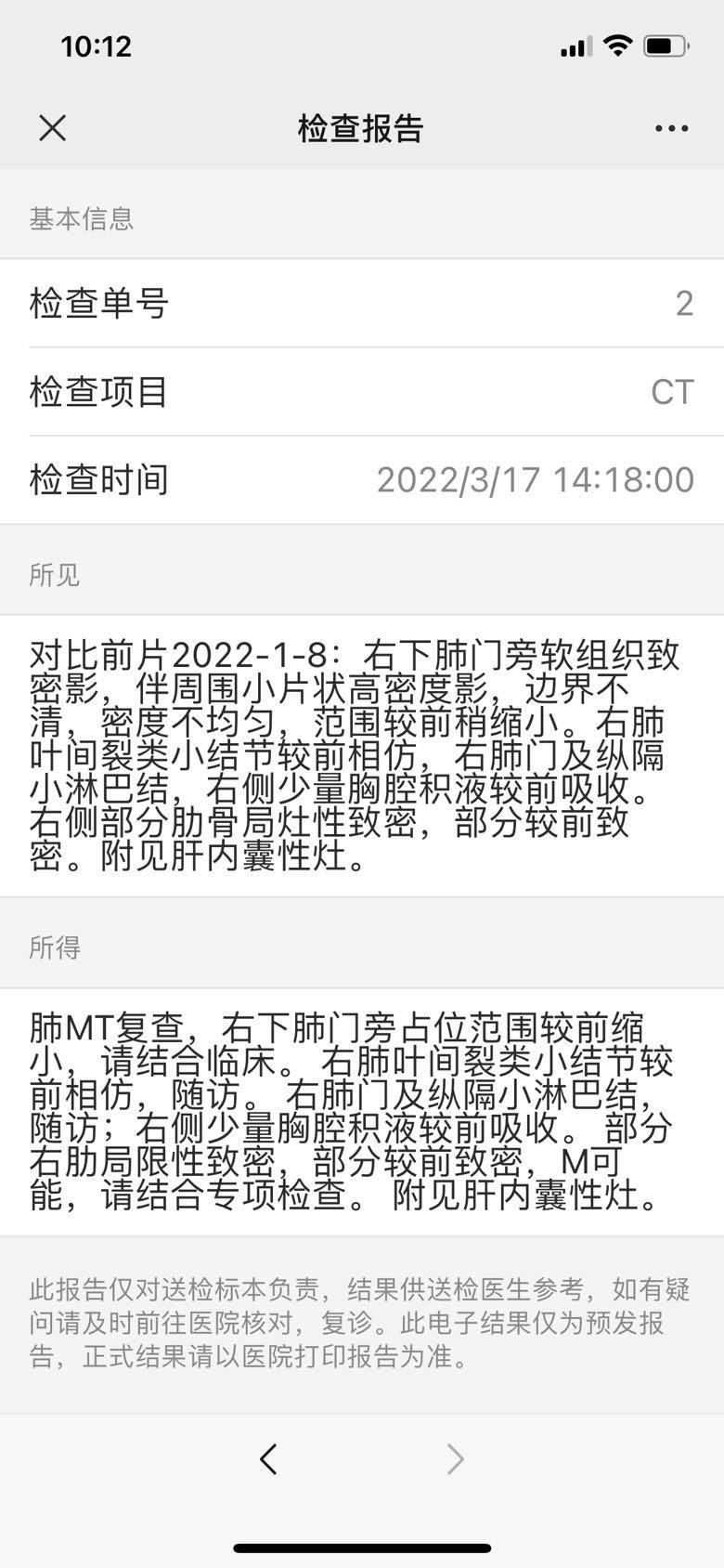 医院重新开放了,去原的医院和主任医师复查。医生说骨头可能是在修复,肿块在缩小就说明靶向药还在起作用,不用纠结缩小的比例。然后肝内囊性灶也没关系,总算放心了