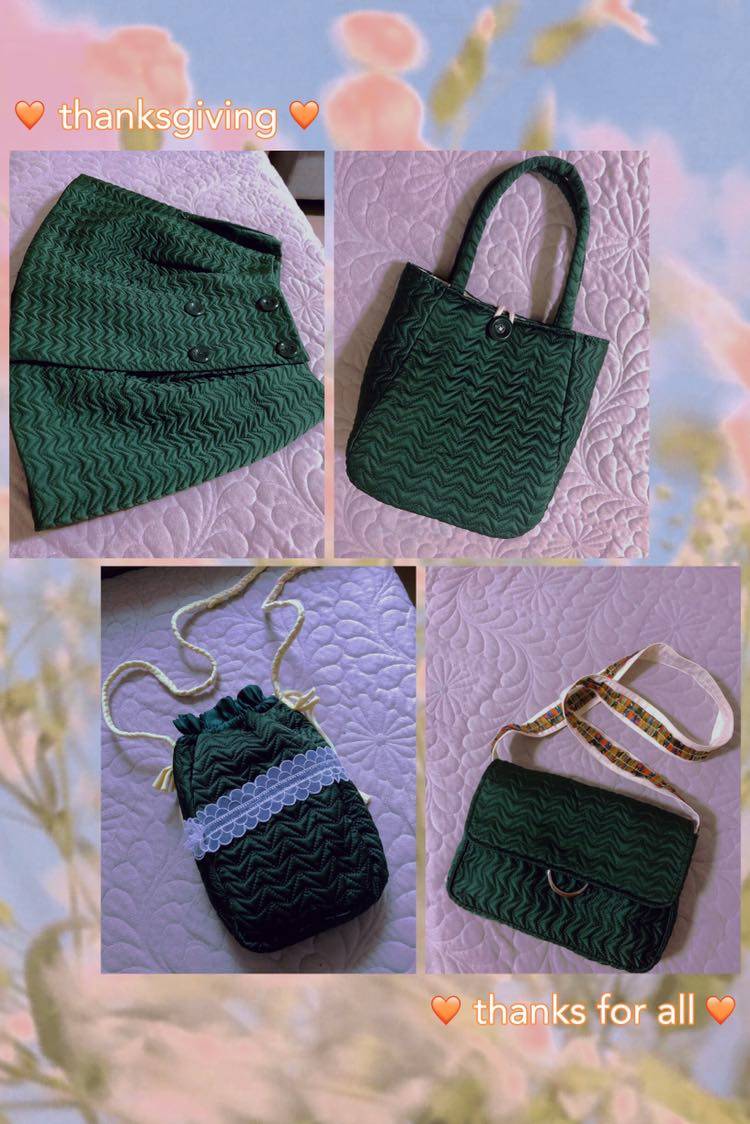 一条闲置了二十多年的小短裙,变成了三款不同的小包。充满生机的绿色,这是春天的气息。