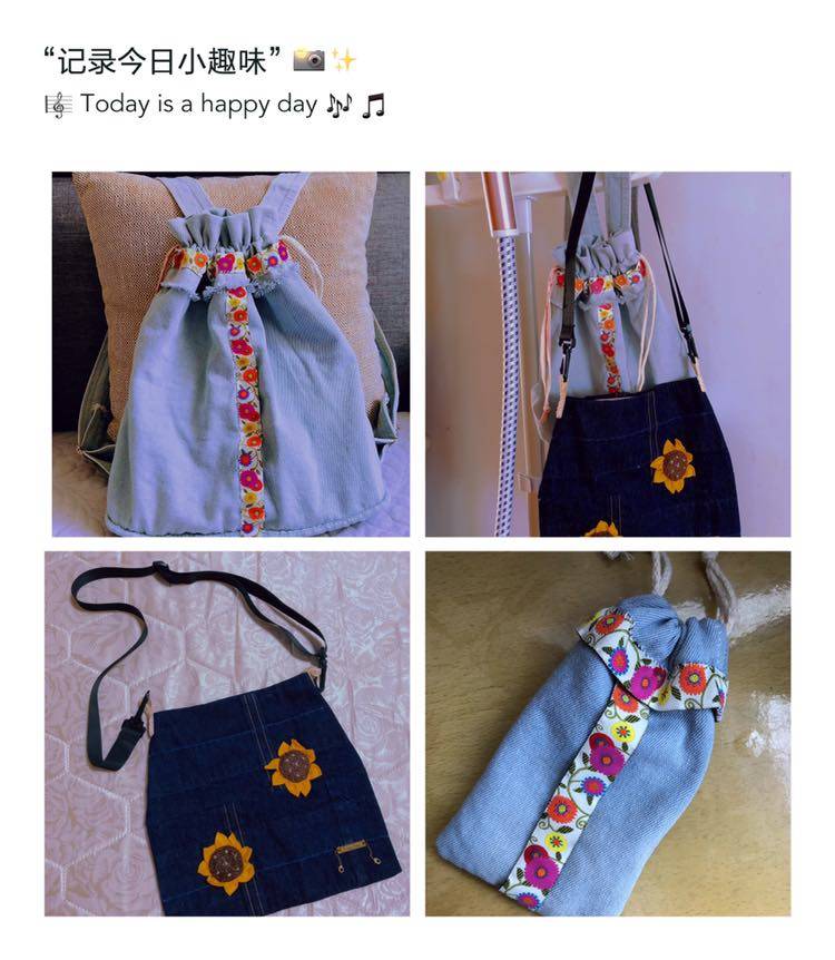 姑娘的一条背带牛仔裙,改成了一个双肩包;一条长了的阔腿裤,剪下来一拼就是一斜跨包,装饰上花带和花朵,芬芳扑鼻,这是春天的味道。