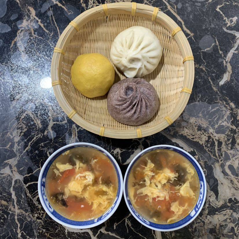 早餐🥣西红柿鸡蛋汤,玉米面窝窝头,紫色白菜🥬🥕猪肉包子,芹菜猪肉包子