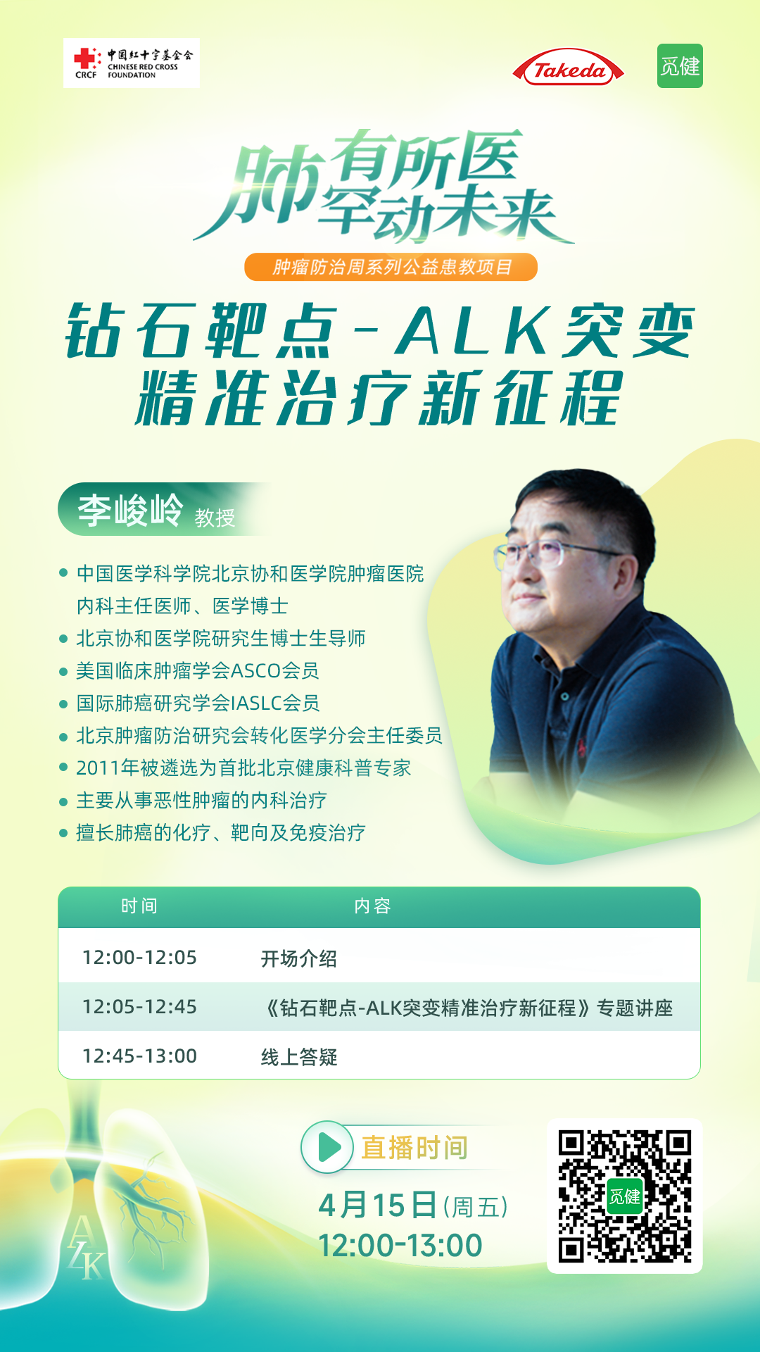 为此,在今年的4月15-21日,正值我国的第28届全国肿瘤防治宣传周之际。我们有幸邀请到中国医学科学院北京协和医学院肿瘤医院内科主任医师——李峻岭教授,为我们带来“【肺有所医,罕动未来】钻石突变-ALK精准治疗新征程”的科普讲座。