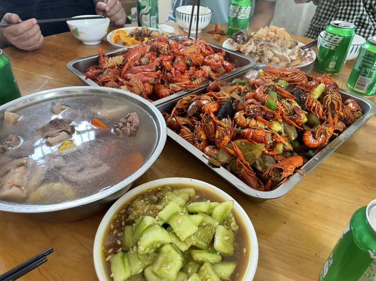 我就打打杂洗洗龙虾,蹲到腰疼,之后就是不停地吃,龙虾,卤鸡爪鸡脚,卤蛋,烧烤,凉面,吃成十二分饱。