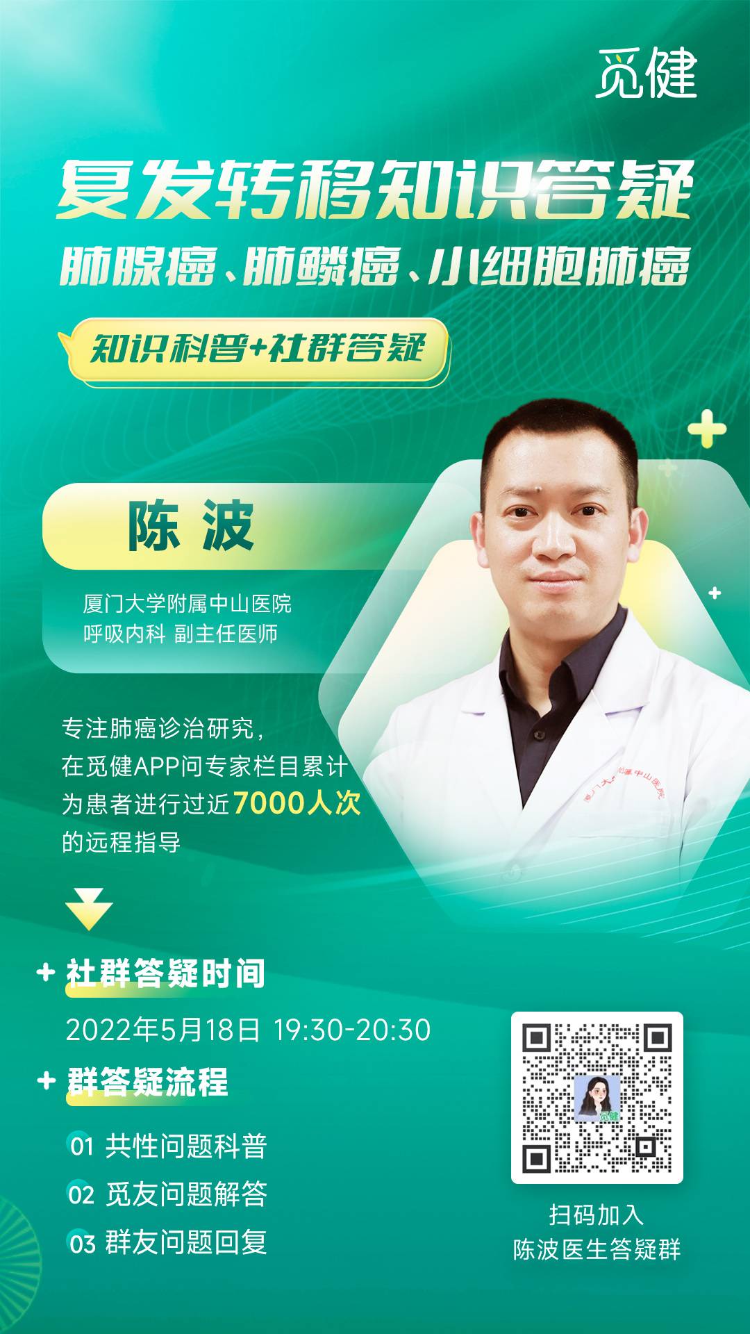 大家可以扫描海报二维码,或者直接搜索微信号:elsmijian002添加康康的微信进答疑群, 把想要咨询陈波主任的问题私信给康康,我们将提前收集10个患者问题,先到先得哦~(到时我们还会在群内抽取群友的问题进行实时回复哦!)