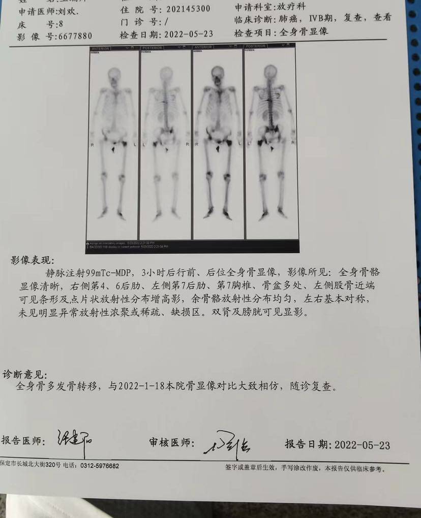 妈妈确诊10个月了,肺腺晚期多发骨转,19突变,一线奥希,复查了三次,前两次缩小,这次肺部跟四个月前相仿,骨扫描与四个月前大致相仿,CEA不敏感,从确诊就正常,血液指标也都正常。妈妈体感挺好,能吃能喝,腰部坐久起来会疼一下,缓一会走路就没事了,左脚脚面偶尔疼,不严重,这几天又说不疼了。主治医生让加安罗替尼,脚部放疗。我考虑几点不想给妈妈换方案,一是复查结果与上次相仿,是不是就说明稳定;二是妈妈体感挺好,能吃能喝,完全看不出是病人;三是一线奥希本身可用的子弹就不多,不舍得轻易换方案。附上妈妈的复查报告,请老师们给帮忙看看,感谢