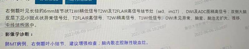 父亲肺腺癌晚期,alk融合,服用阿来替尼一年。本月复查核磁发现新发脑结节,不知道是否脑转?目前没症状可以随访吗?肺部原发灶稳定,之前1.3*0.8,这次描述为直径7mm。