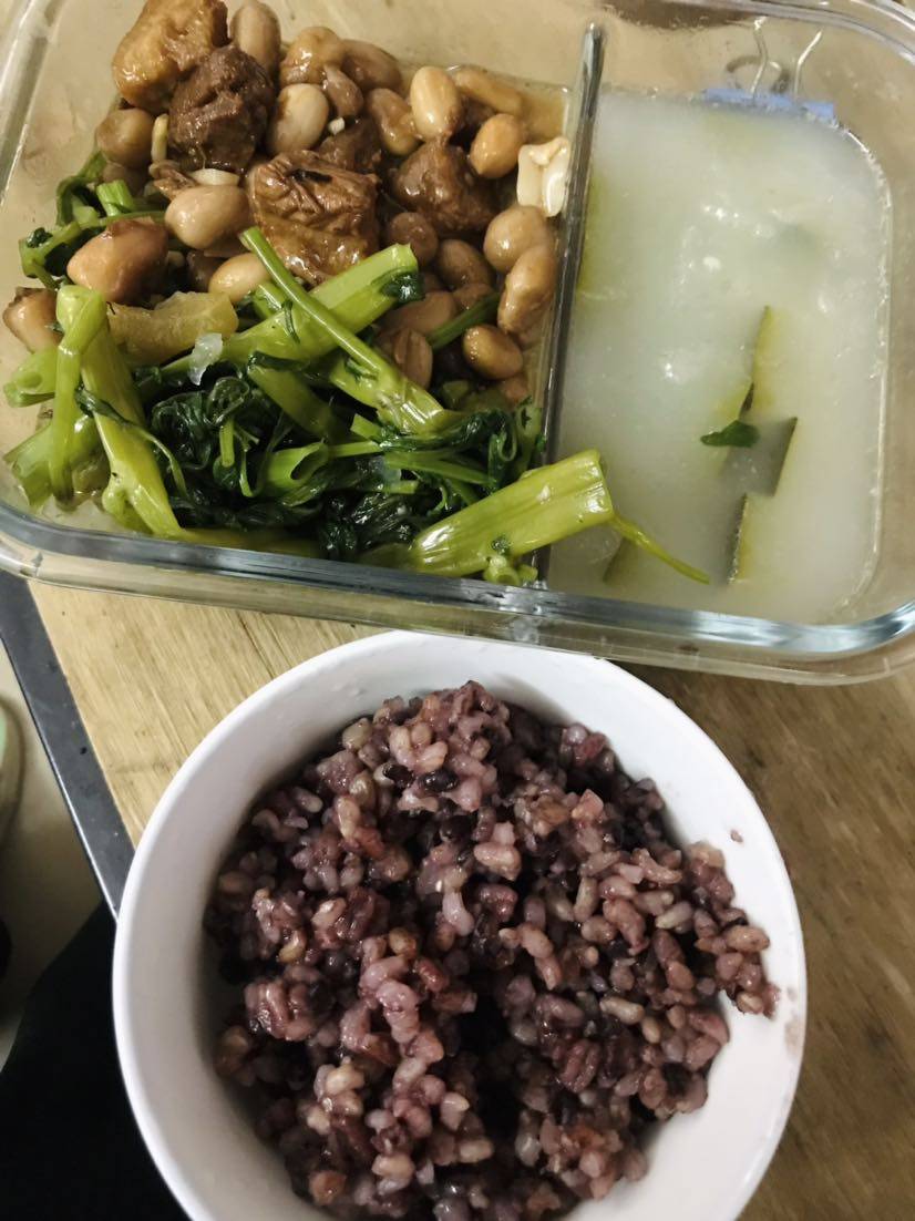 这是我中午在饭堂打的菜,我自己煮的糙米饭