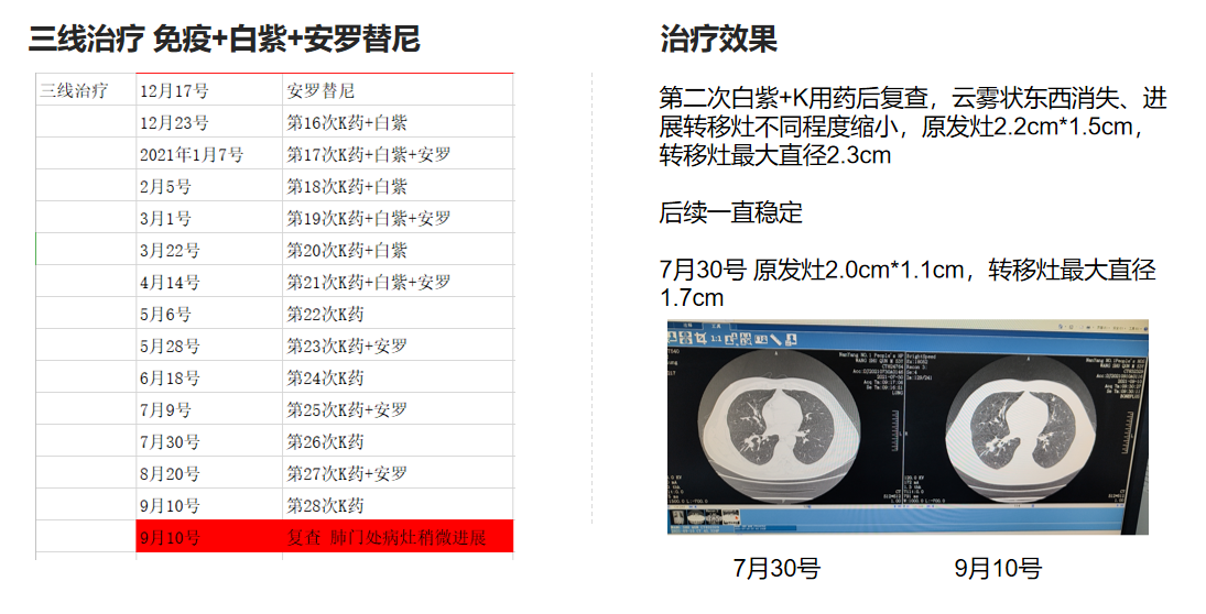 在准备用白紫前,我家医生告诉我说,最近医院有做白紫和抗血管生成药联用PD1的研究,有几位患者用,效果相当不错呢,白紫亲和力比较强,就是骨髓抑制比较厉害,我们用的时候要多关注血象。于是,我们又开始了三线治疗,治疗两次后,复查评估肺部病灶缩小80%,我家医生笑着说,看来,肿瘤现在又休眠了啊。后续一直SD,很幸运这个方案一直维持到了2022年。但是从2021年10月份,体感上又有了细微的变化,爸爸开始了咳嗽。可能它早已经开始慢慢不安分了吧……