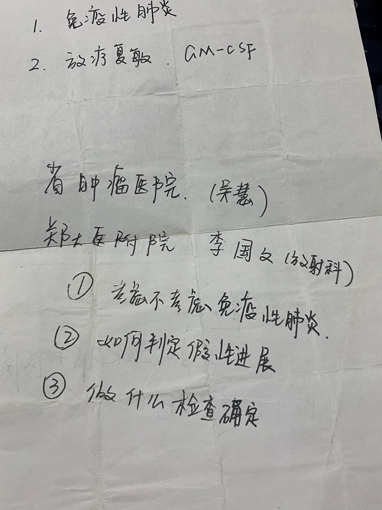 我先去见了郑大一附院的李主任,我家医生告诉我李主任是位博学的医生,人也特别开朗。李主任拿到片子,指着给身边的医生看,这里...这里...看完后,他说,姑娘,你去挂几个肿瘤科医生的号,让他们给方案,给出方案后,你拿来给我看,让肿瘤科医生先上,放疗暂时不考虑,排除免疫性肺炎,我认为是进展。