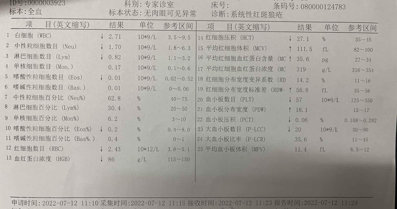 今天去复查,因为加了硫唑嘌呤,白细胞降下来了,医生还说怀疑病情复发,又要抽血检查,上个月才查过一模(mú)一样的检查都是没问题的,大概率吃了三周硫唑嘌呤导致白细胞降低,医生就说再查,真是挺无奈的,检查费又要小一千,