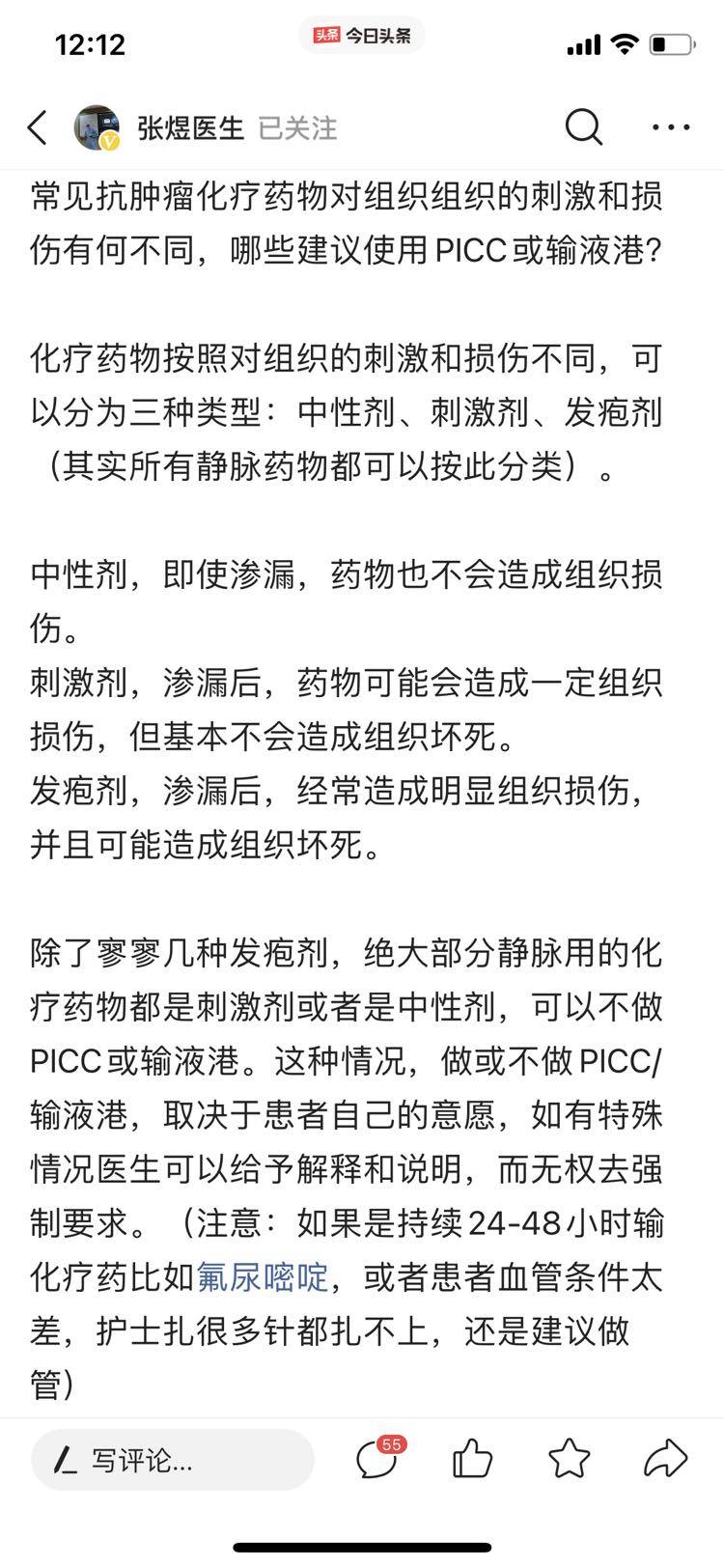 我tc方案四次,白蛋白紫杉醇+环磷酰胺,直接静脉输液,医生说安全方便,没有问题,尽管护士为了她工作方便,说我血管条件不好,很细,谨慎的可以输液时用上水胶体敷料,事实证明我一点事情没有。有些医院医生也不问意愿要求患者做输液港或picc,却对可能出现的血栓、各种不便、感染等风险几乎只字不提,这其中的利益关系,大家真的看不懂吗?我看过张煜医生发的科普,发出来供参考一下。大家多做功课吧,不必须的治疗就不要折腾自己了,作为患者已经千疮百孔了,看到这些现状真是有点伤感。