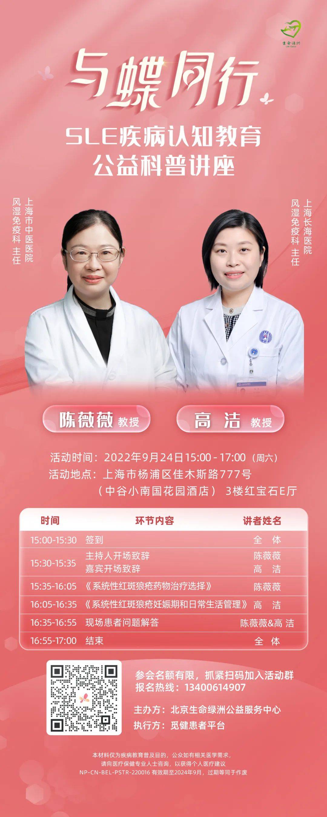 来自上海市中医医院风湿免疫科的陈薇薇主任和来自上海长海医院风湿免疫科的高洁主任将会为大家进行现场患教,为大家分享狼疮药物选择和妊娠管理的知识,参加的蝶友不但能够获取更多狼疮知识,还能够获得面对面和专家交流学习的机会。机会不容错过,你还在等什么,快快扫码参加吧!
