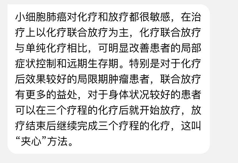 昨天医生说四化之后要加放疗,预计可能25次,夹心放疗,看来要坚持完成六次化疗了,昨天网上问诊了小细胞化疗联合放疗的治疗手段,听起来好像会有不错的效果(附上截图),主要妈妈现在各项指标可以,就不想放弃标准治疗方案,那就再加把劲吧