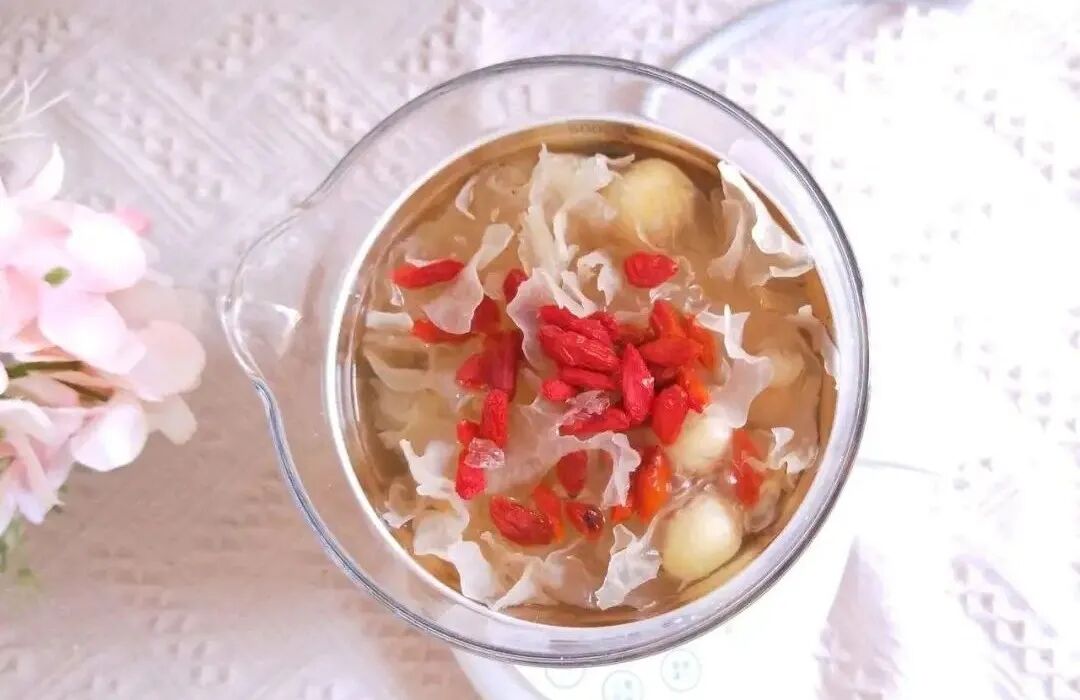 枸杞甘、平,归肝、肾经,有滋补肝肾、益精明目的作用,《本草述》:“疗肝风血虚,眼赤痛痒昏翳。” 银耳甘、平,归肺、胃、肾经,有补肺益气、养阴润燥的功效。补脾阴的山药搭配养肝血的枸杞、滋胃阴的银耳,适合脾阴虚而心情烦躁的人食用。