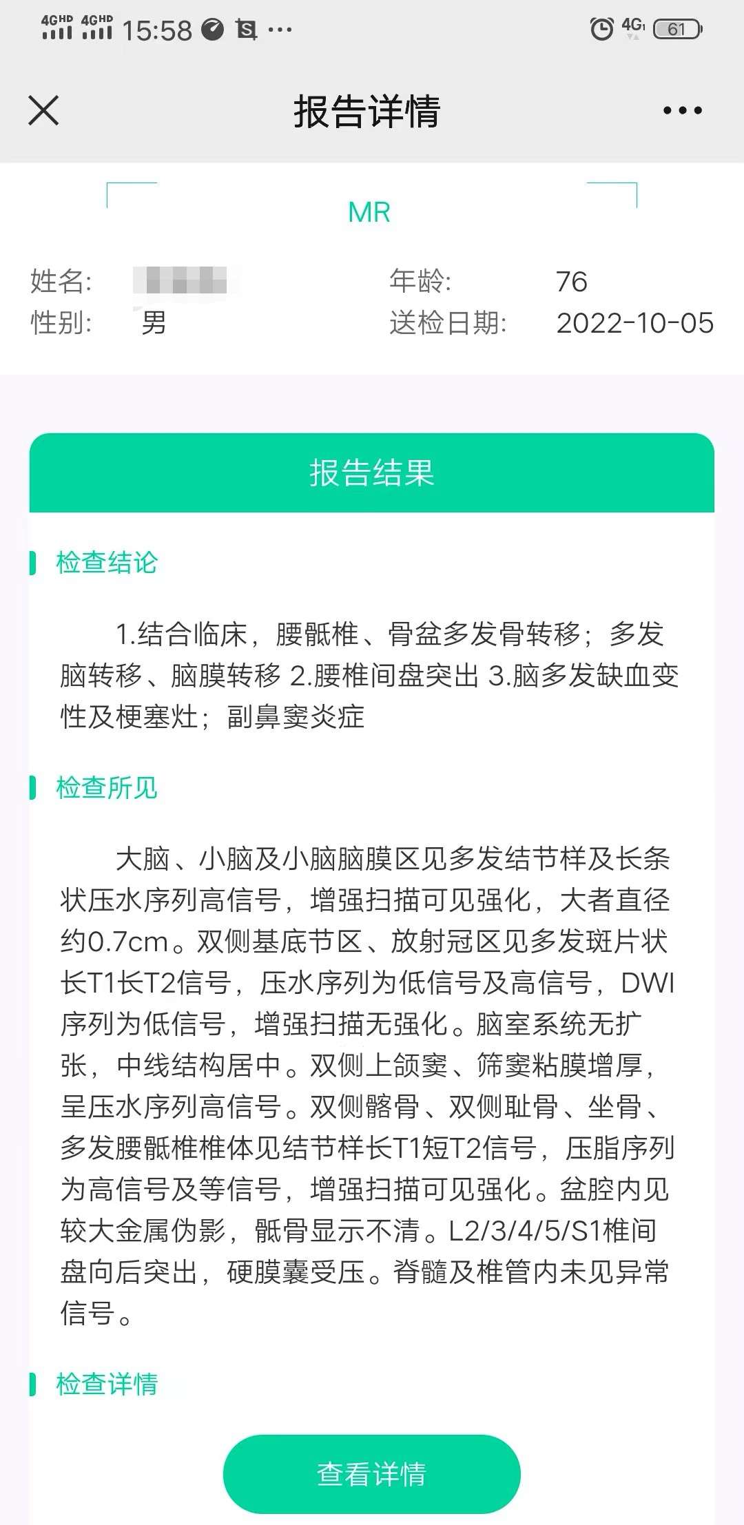 爷爷三年半前查出肺腺癌早期,手术切除半页肺后,每年复查胸部ct和肿瘤标志物无异常。最近说颈椎和后背疼痛,嗜睡以及看东西重影,通过核磁共振和骨扫描检查出多发脑转移,脑膜转移,多发骨转移,今天刚做完各项检查,明天取病理,预计基因检测结果得一周后才能出来。医生建议先做脑部放疗,以及骨头最疼痛处放疗,但是我家人考虑放疗只是局部的,对于爷爷这种多发型的可能控制不住,所以想在基因检测结果出来前做一次全身化疗,或者盲试靶向药,或者还有其他好的方案吗?希望大家能为我爷爷现在以及后续的治疗提供一些建议,我现在真的很无助,非常感谢大家!