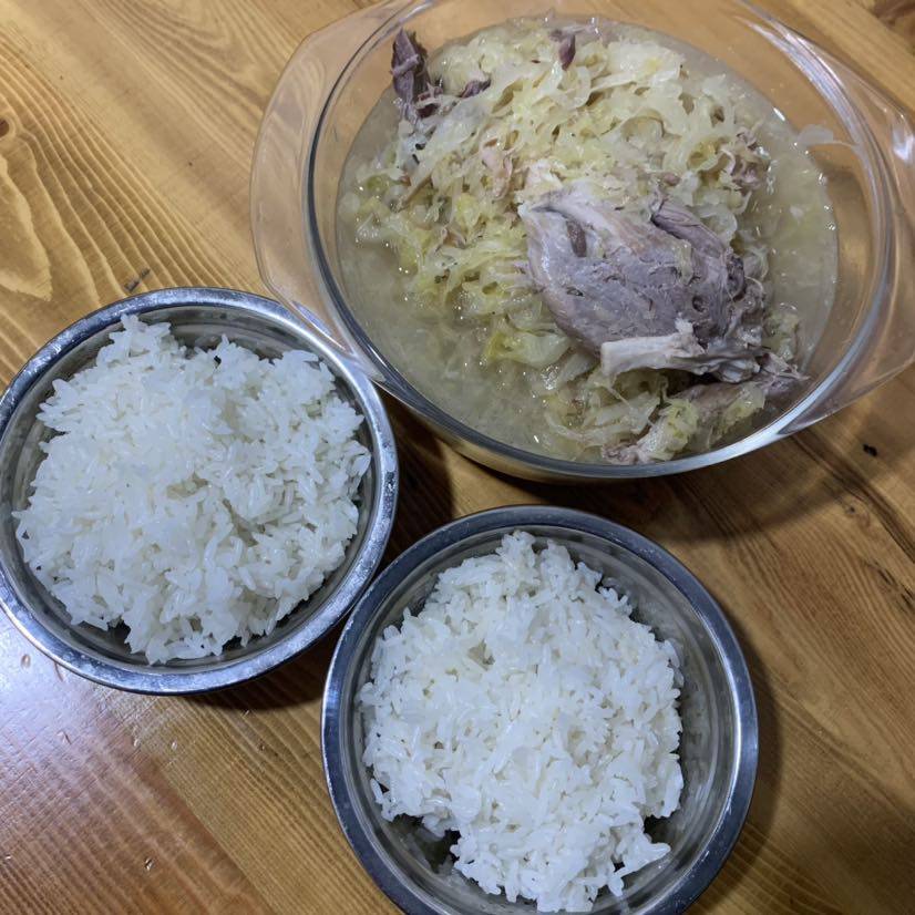 昨天晚上做的猪肘子炖酸菜,放一夜今天在吃,入味,去做核酸之前,去小厨房把米饭焖上,回来吃早饭。