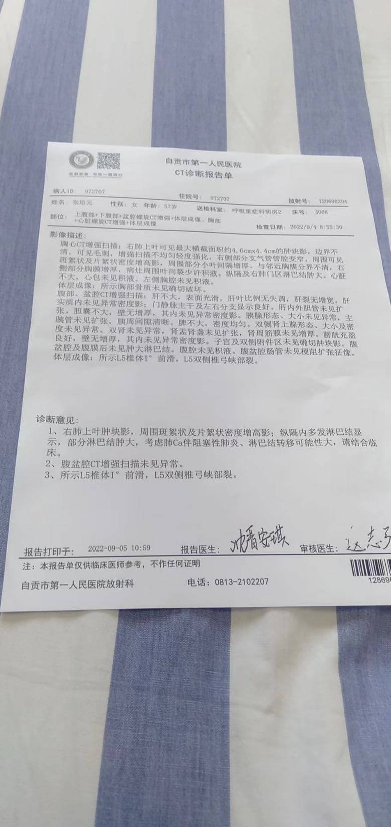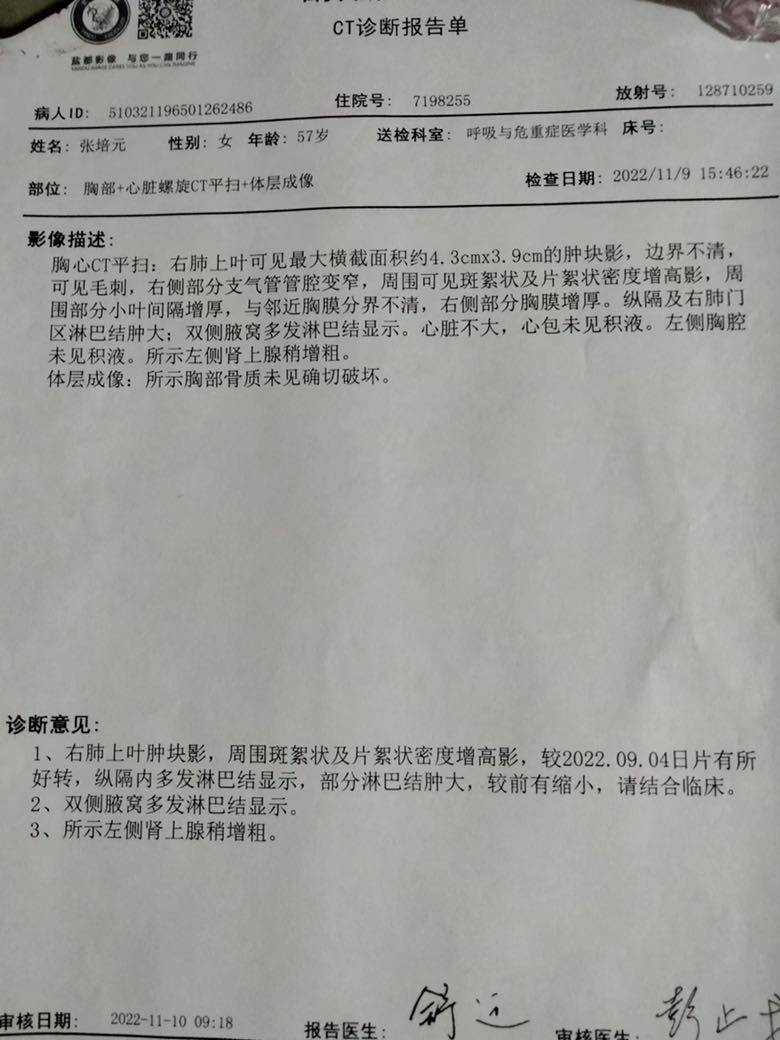 11月11日,复查的结果出来了,我也在知乎和觅健上咨询过,奥希替尼两个月,我妈妈肺部肿瘤从4.6*4.4变为4.3*3.9,说实话这个结果很不好,因为复查是平扫,有可能实际大小不止,所以就是说原发肿瘤大小几乎没变,而且双侧腋窝多发淋巴结、左侧肾上腺稍增粗,看到这个报告整个人真的不是滋味,是不是证明奥希替尼对我妈妈没有效果?