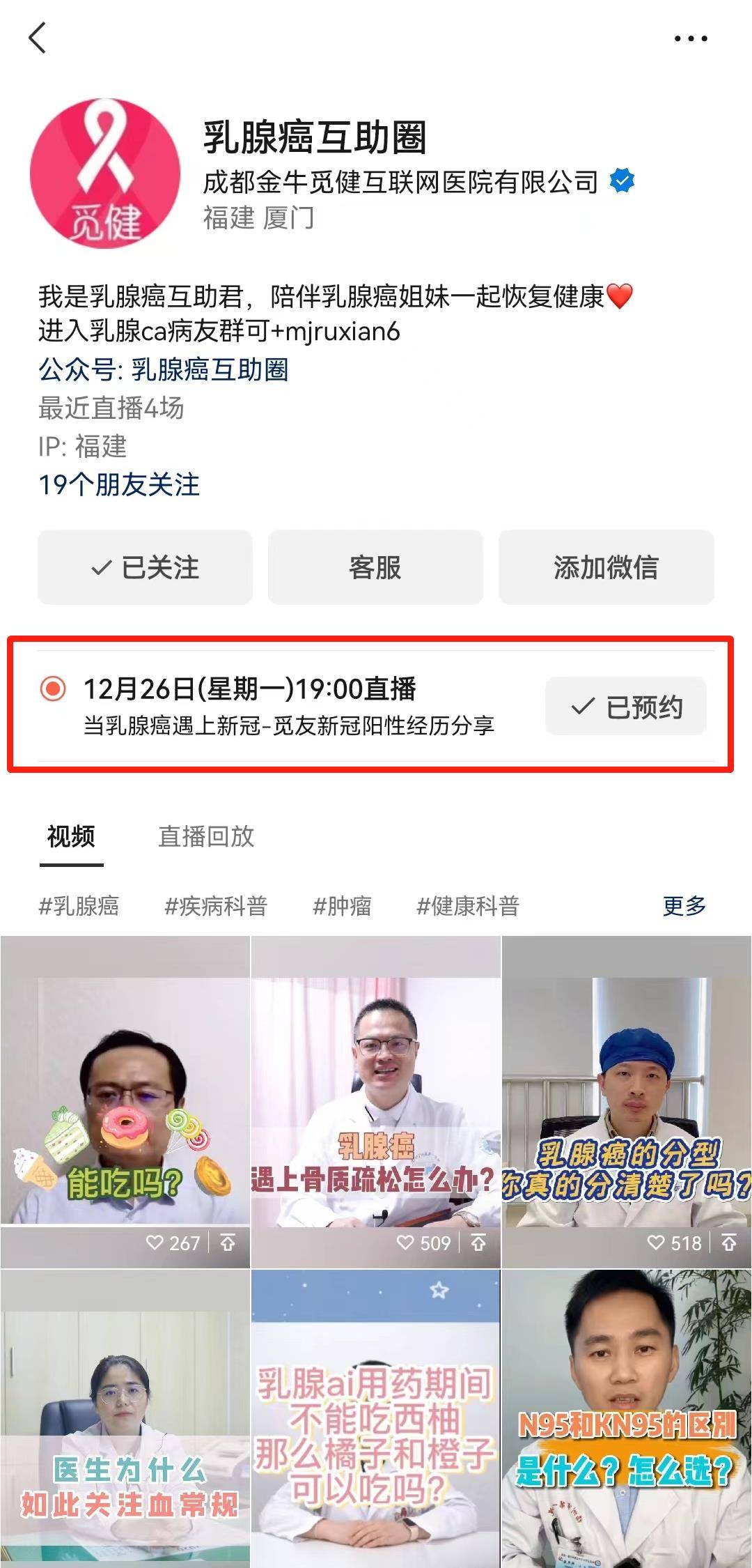或者关注视频号【乳腺癌互助圈】点击预约按钮