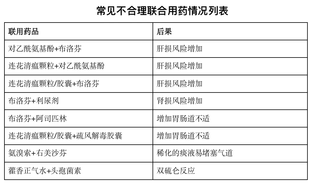 如退烧药布洛芬不能和感冒药泰诺、白加黑同时使用;酚麻美敏片、氨酚麻美干混悬液等不要和感冒灵颗粒、速感康、强力感冒片等混用[6]