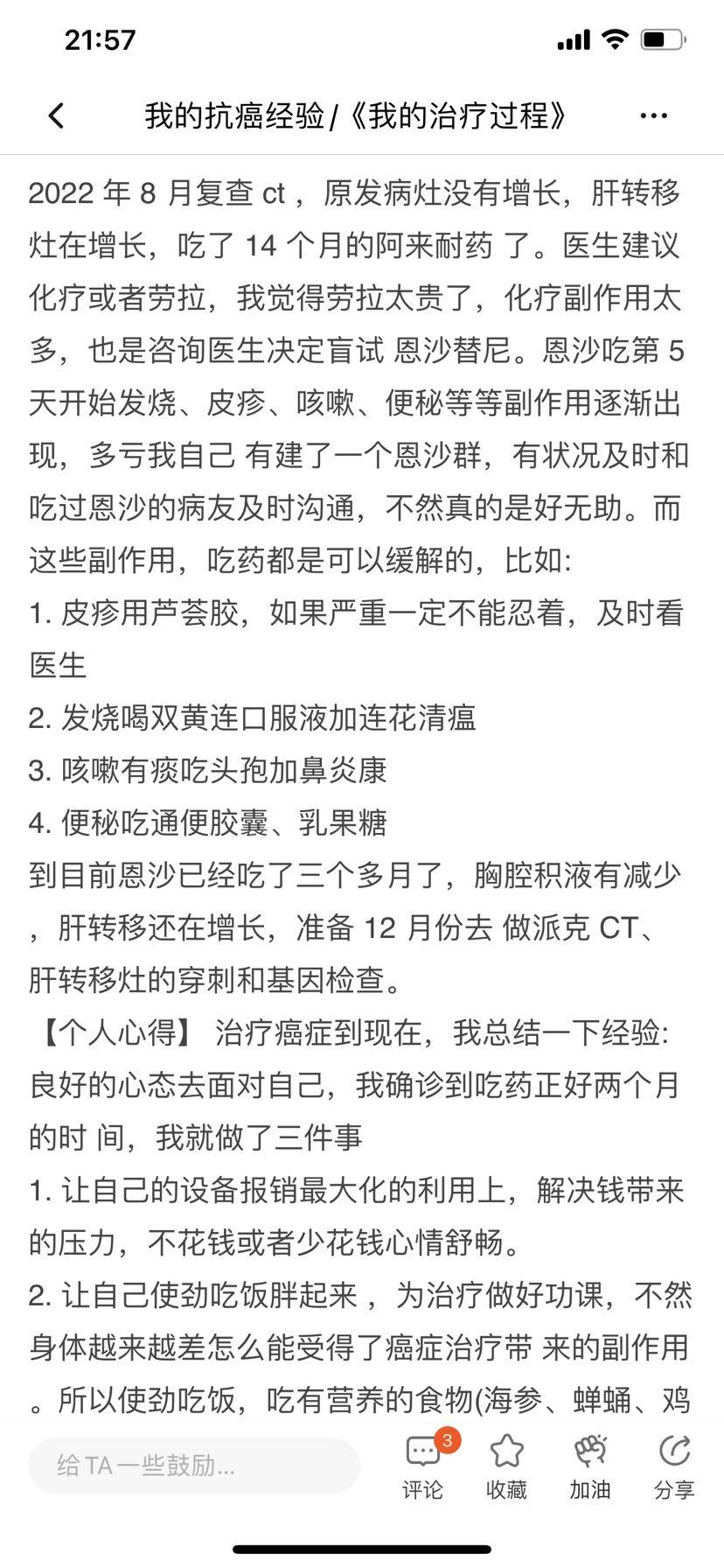 妈妈患肺癌已经有三年了,这三年来一直在接受治疗到现在,下面是妈妈检查以及治疗的过程。2010年10月,妈妈体检出肺癌IV期,纵隔淋巴转移,肝部转移,去省肿瘤医院复查,做了PET-CT,结果一样,省肿瘤