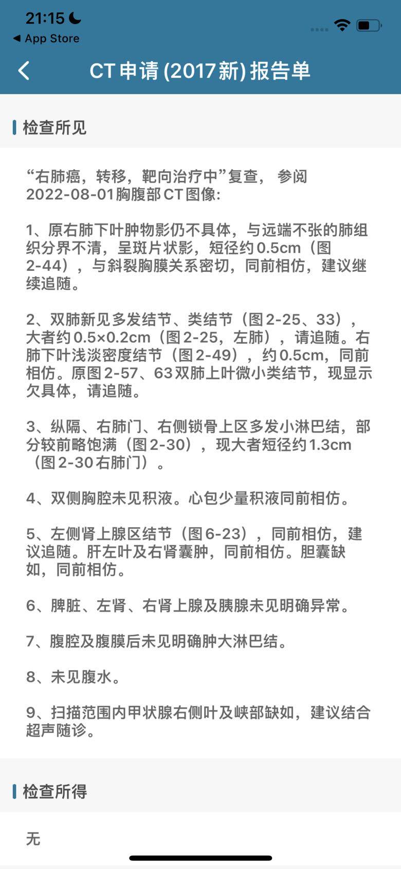 因为疫情,婆婆半年没有复查,12月底阳了,难受了小二十多天,期间克唑减量每天1颗,恢复的差不多后回到每天两颗的量。这次复查有些变化,等待周一看医生建议,也回这里问问大家意见,部分进展(淋巴结节较以前的0.9cm变成了1.3cm),是否应该换药,还是缩短复查时间,再观察观察