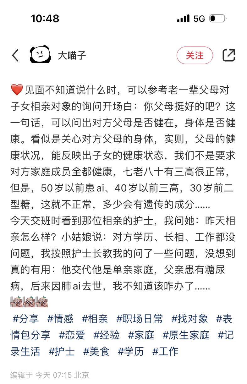 今天在“小红书”上看到一个东肿小医生发贴,聊了关于相亲注意事项,其中一点提醒谨慎考虑父母在50岁前患癌的相亲对象!
