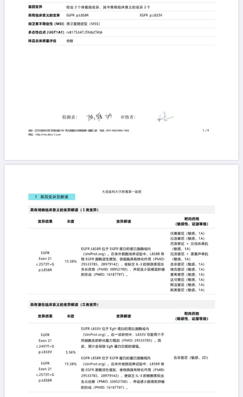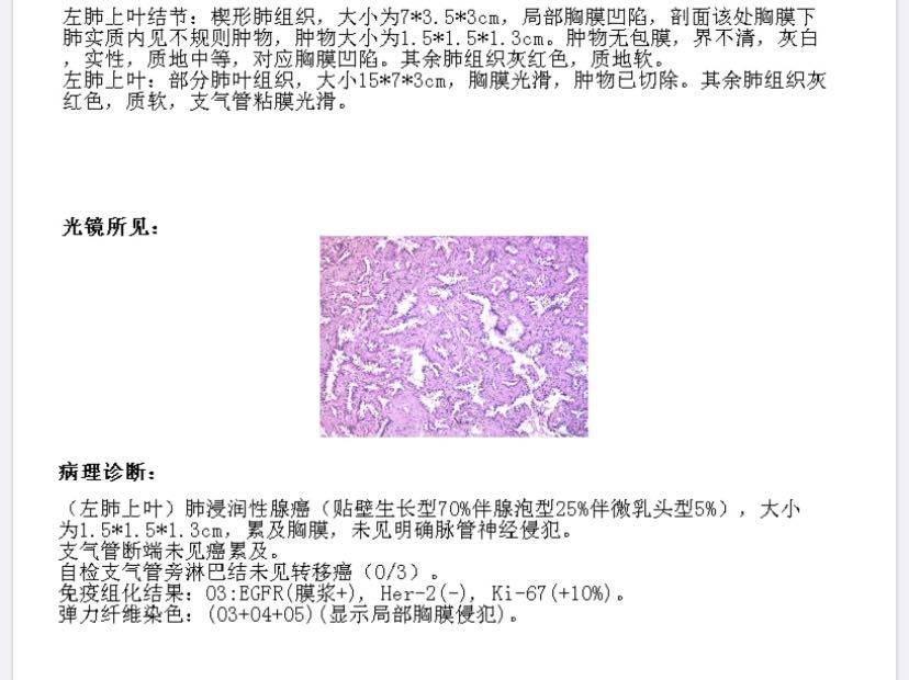病理结果是个浸润性的肺腺癌,没有气道和淋巴转移,但是侵犯了胸膜,肿瘤大小1.5*1.6,在左肺上叶。是个1b期的。贴壁70%,腺泡25%,微乳头5%。期间除了主治医生,又找了两个肿瘤专家看了,都是建议化疗或者靶向药辅助治疗。基因检测EGER21 L858R。最后在医生的建议下,自费伏美替尼2年,随访检查。因为化疗的话伤害太大而且就无法瞒着她了。