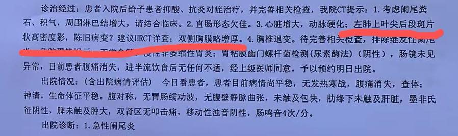 其实早在2019年5月的时候,我就带我妈做过全面的体检,住院检查,其实那次的出院小结里,胸部的检查结果就写的有阴影,但是我问了医生,说没事,我就再没有深究,也就这样,深深的耽误了三年,没想到这个,我就恨不得抽自己俩嘴巴…