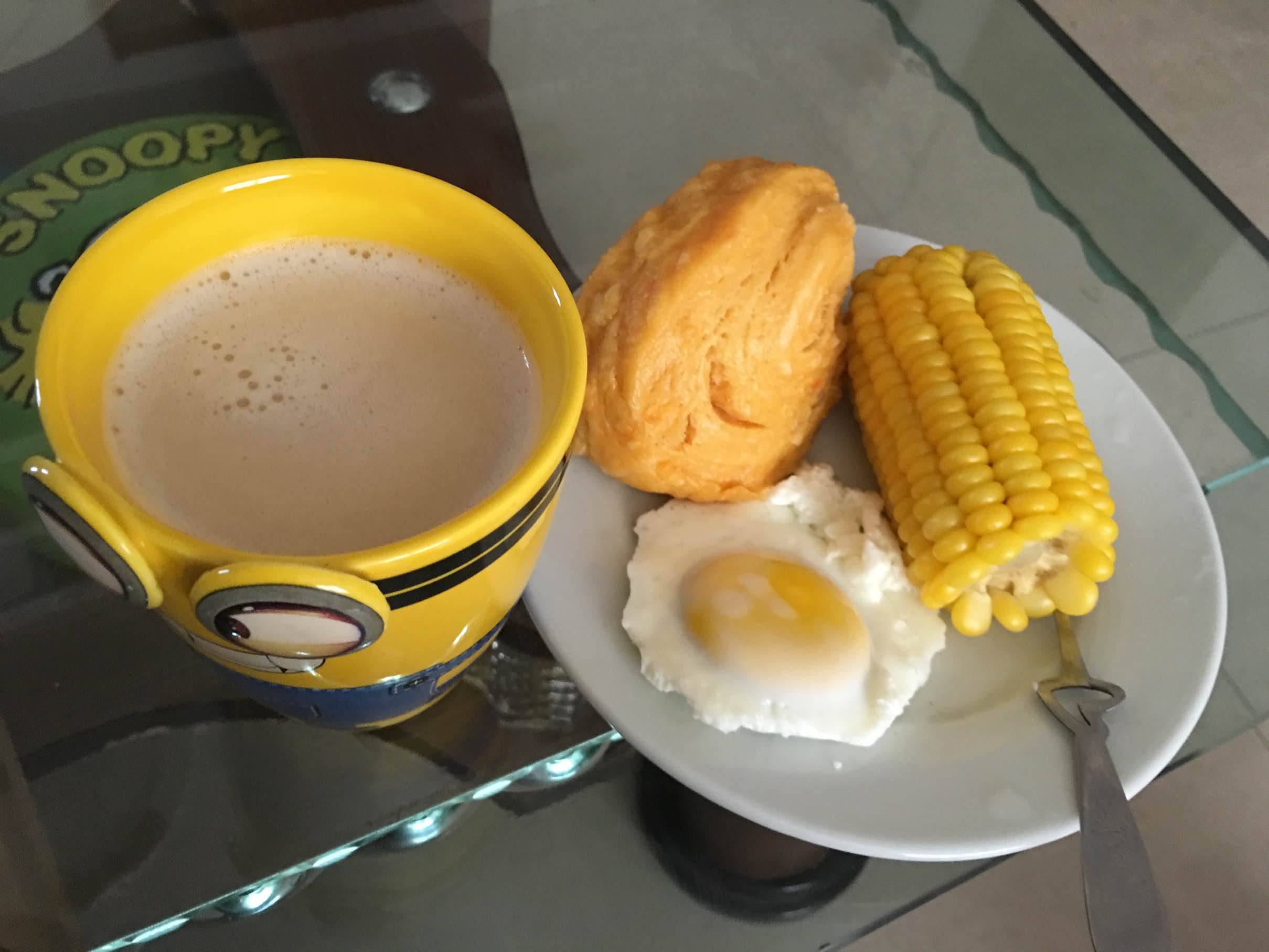 晨练了一下消耗了点还好不算多一个馒头一个蛋半个玉米九分饱的量我按照早吃好中吃饱晩少吃但差不多每餐不会吃太饱因为还有大量的水和水果要吃