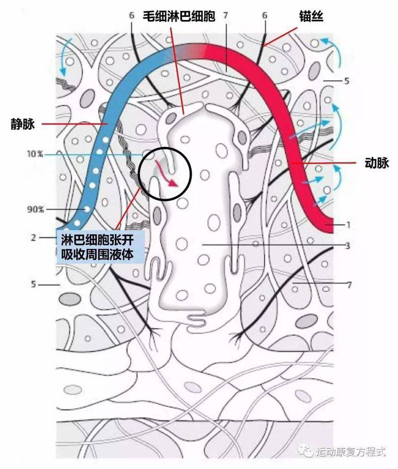 我们身体浅层的毛细淋巴管与皮肤存在广泛地联系,如图所示,每个毛细淋巴细胞都会发出一条很长很细的丝,我们称之为锚丝。这些锚丝与皮肤下筋膜相连接,也就是说我们只需轻轻的牵动皮肤,就可以通过锚丝的牵拉使单层的毛细淋巴管细胞张开(如图中圆圈所示),吸收周围液体。如果我们一直往一个方向做牵拉时,这些淋巴细胞也会朝同一个方向张开,从而促使淋巴液向一个方向流动。
