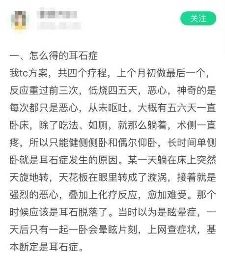 一位觅友曾分享到,肿瘤切除术后,由于疼痛,只能一直保持侧卧。重力作用再加上供血不足,导致耳石颗粒的粘性变差,诱发了耳石症。