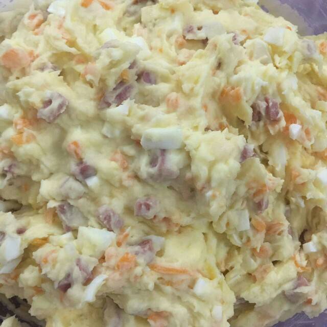 先将土豆、鸡蛋、火腿、胡萝卜、青瓜全切一小颗,然后用沙拉酱全部搅拌就可以了。