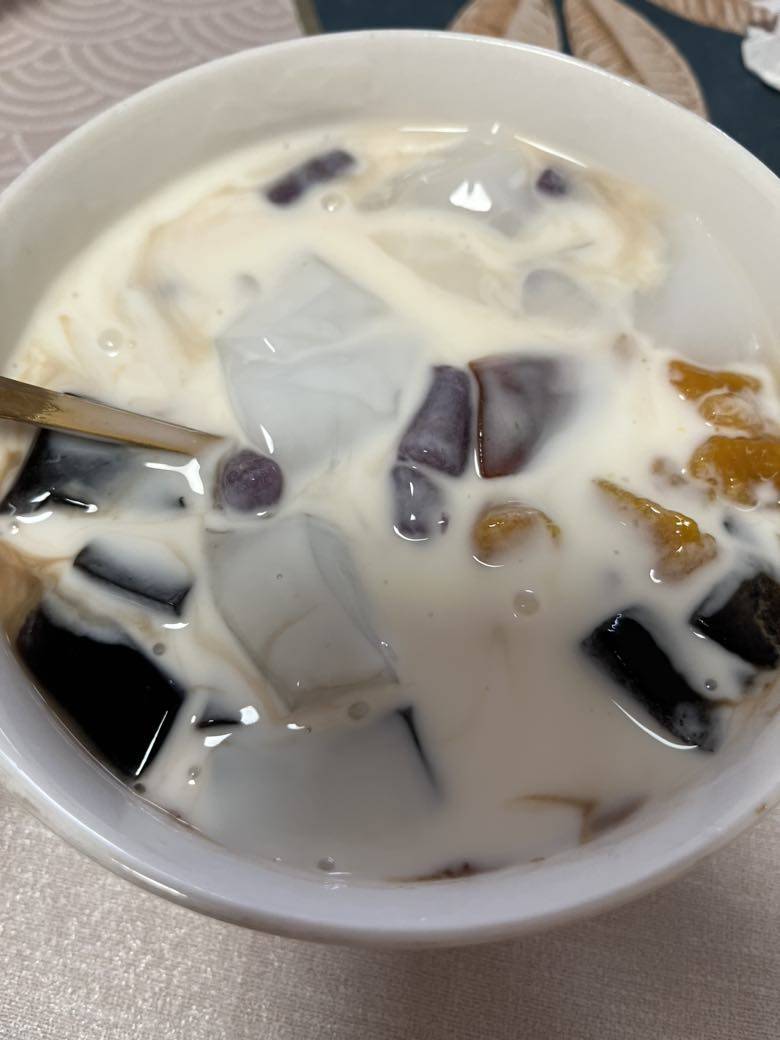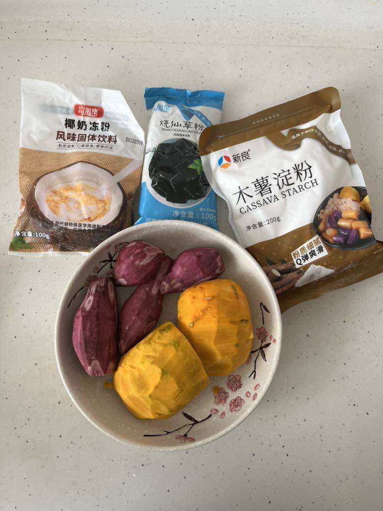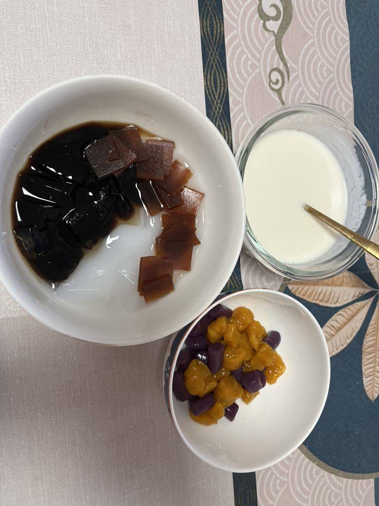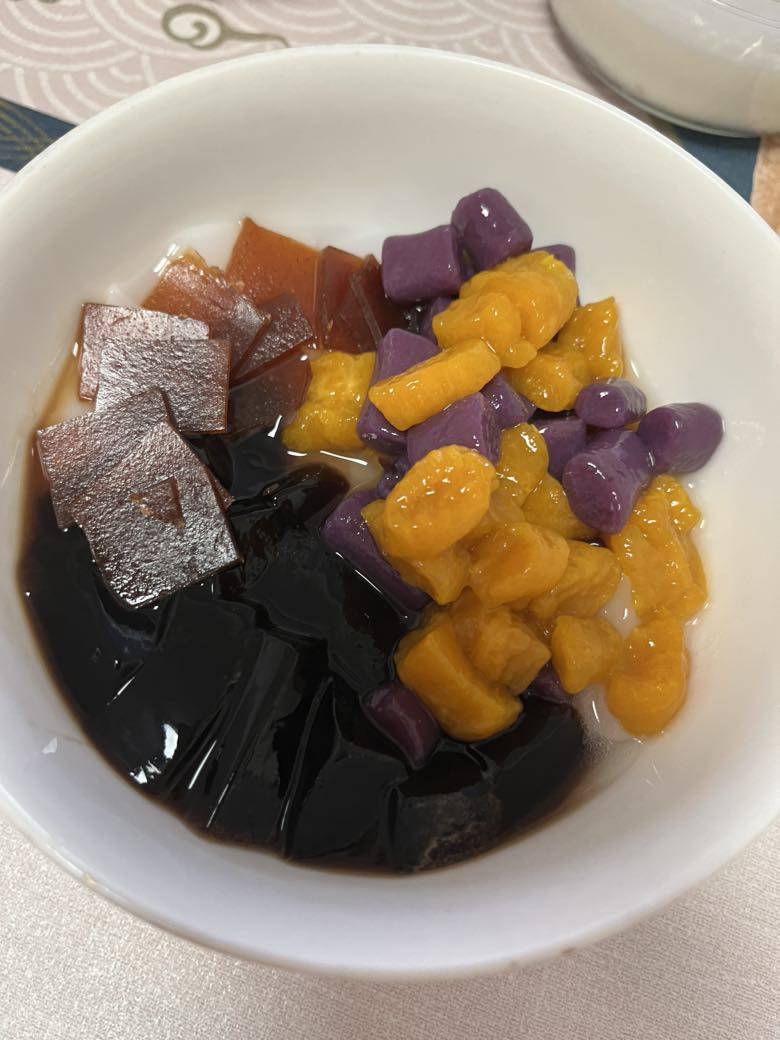 今天气温35度,酷热,没有出去走步,在家开着空调,上了一节瑜珈课,然后给孩子做了芋圆。紫薯和南瓜的,还做了揶冻和烧仙草。放了几片山楂卷,用自己做的酸奶拌上,放进冰箱,等孩子放学回家就可以吃了✌️