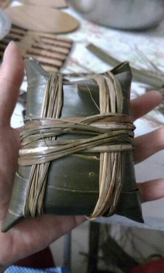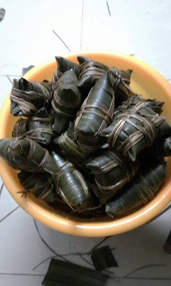 用本地的叶子包的,叫柳兜叶,这叶子还有药效的呢。。外面买十多块一条吧。订的另外算,今晚齐心协力喊了几个啊姨一起包,才两个小时搞定了,不然,现在都还在忙呢。。