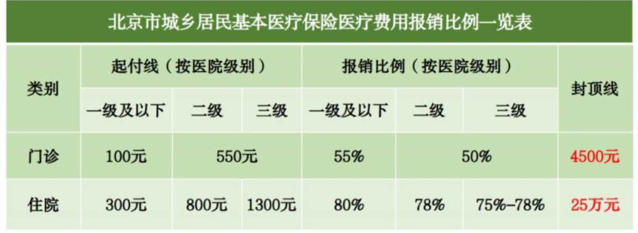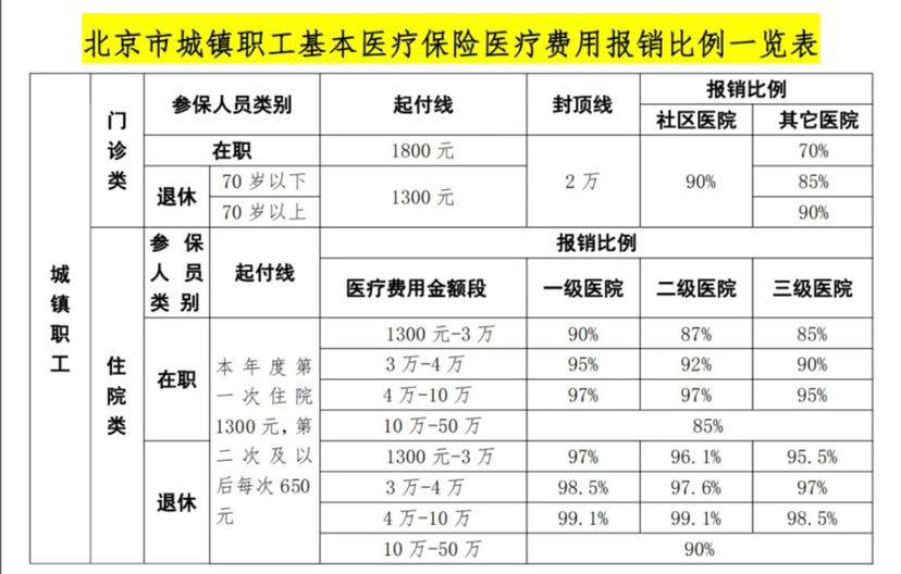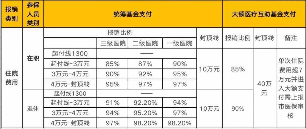 每个地区不一样,这里用北京举例。医保都有起付线,就是超出起付线之外的部分,才可以报销。报销金额中年度医保统筹支付10万元,年度住院大额支付40万元。