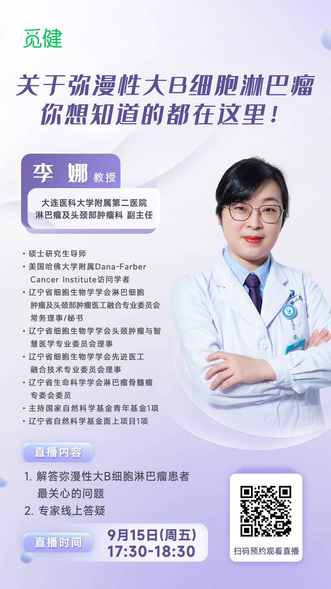 为了解答觅友们关于弥漫大B细胞淋巴瘤诊疗过程中会产生的疑问,觅健特别邀请到 大连医科大学附属第二医院淋巴瘤及头颈部肿瘤科副主任李娜教授 于 2023年9月15日(周五)17: 30-18:30,为觅友们开展主题为【关于弥漫性大B细胞淋巴瘤你想知道的都在这里!】的线上直播!