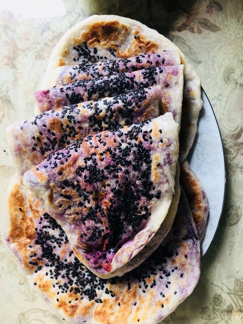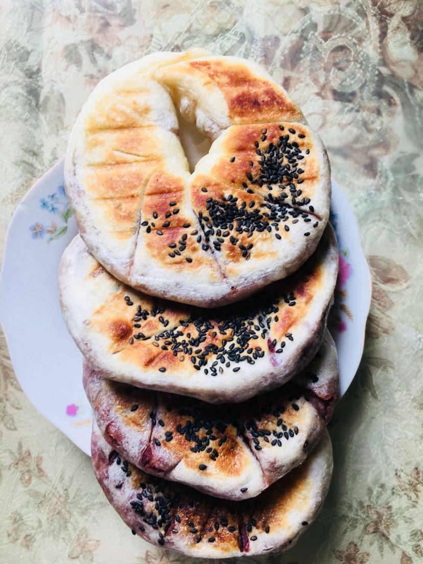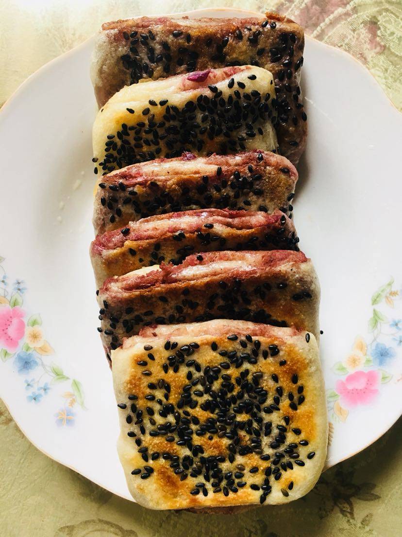 待面发酵好后(也可醒发一个小时)即可,面要和的软点,这样冷了也不硬,分别做好了饼子,电饼档里放少许油煎一下,我今天用了点油酥更好吃,样子不好看,味道真的不错,外酥里软。我是越做越大,耗时一个上午,我吃枣泥紫薯馅的,红枣的甜味满足了对甜食的需求,想吃甜的可以尝试一下哦