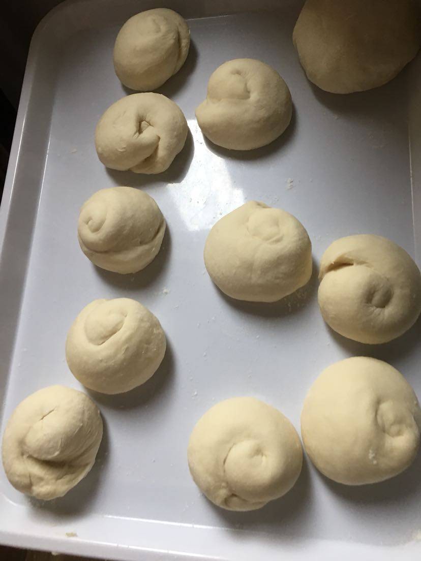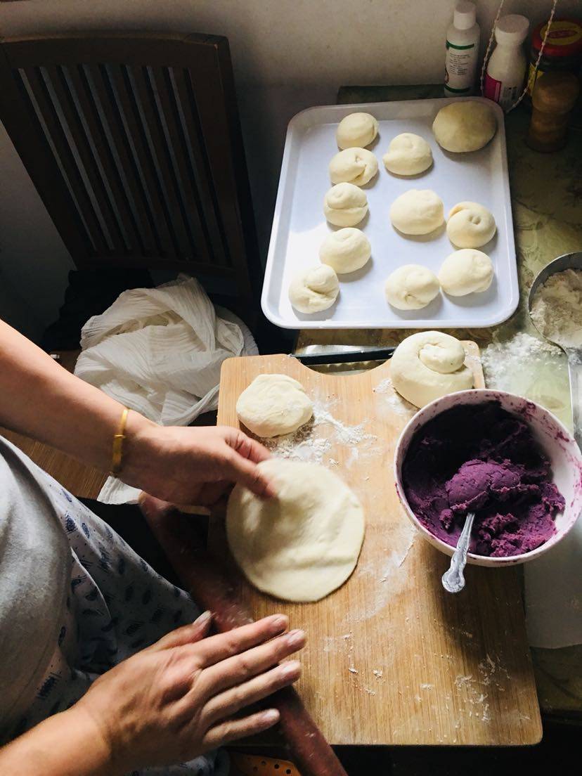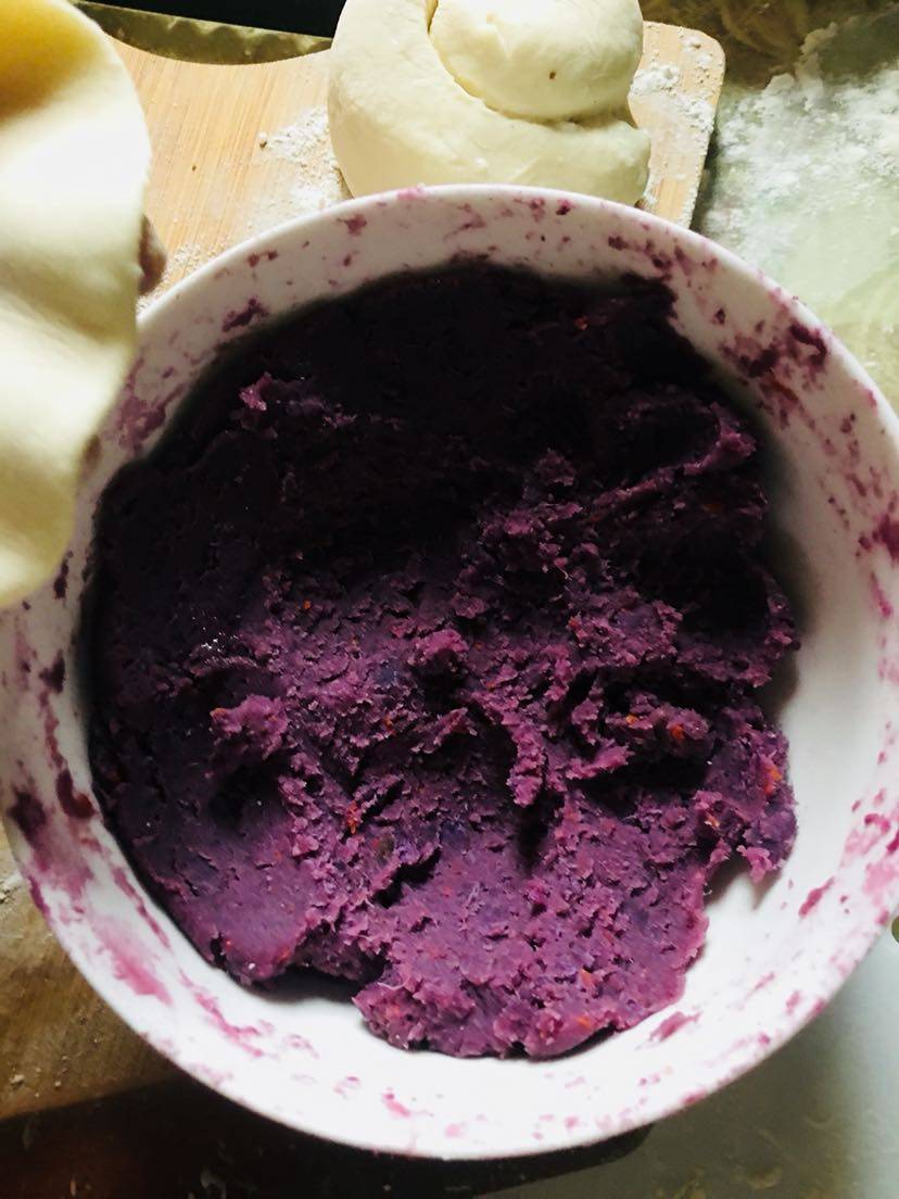 今天上午和了点面,加了一点酵母粉,两个紫薯洗净切片,微波炉高火十分钟,分两份一份加白糖、桂花酱、奶粉,压成泥状搅拌均匀,另一份加入红枣泥、奶粉也压成泥搅拌均匀,这样两种馅完成备用。
