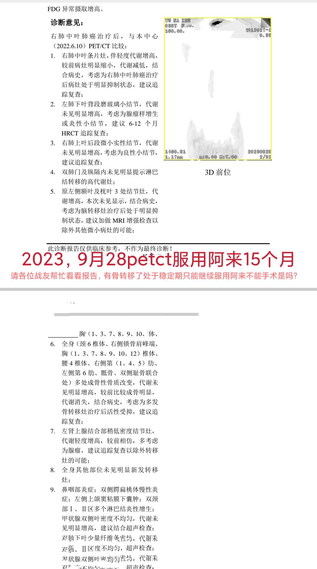 6月6号病理确诊肺腺癌,主病灶6.2✖️5.8cm,肺内多发小结节,大者约1.9cm,右胸腔少量积液,由于比较害怕,和医生商量之后基因检测并化疗,6月7号开始第一次化疗(培美贝伐联合铂类),精神状态良好,次日出院,回家等待基因检测结果。大概一个多星期基因检测结果出来,告知我们基因19突变,13号去医院拿了阿美替尼,自此开始了靶向治疗。